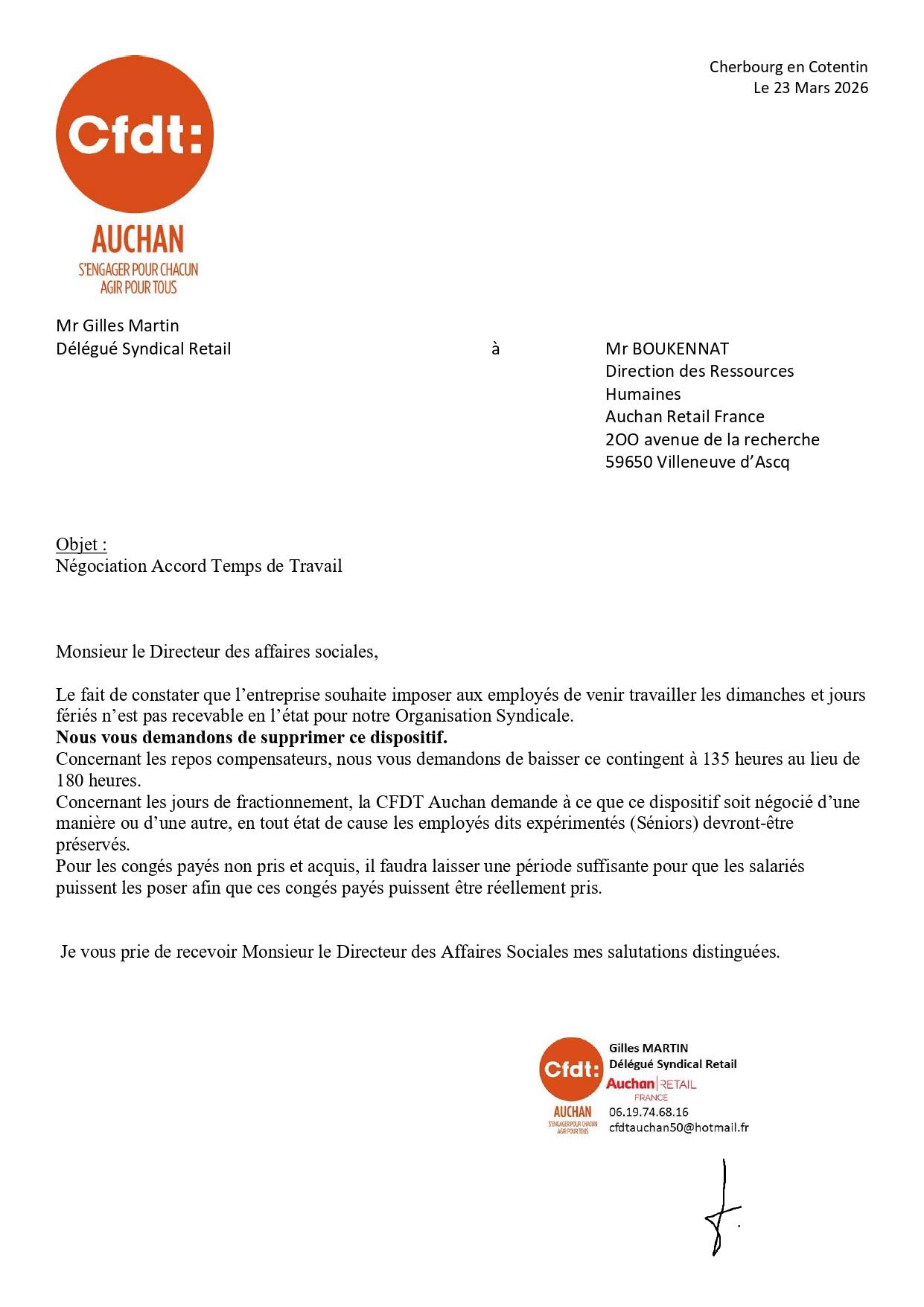 Courrier envoyé à la DG : Accord temps de travail, la CFDT a des attentes fortes (23/03/2026)