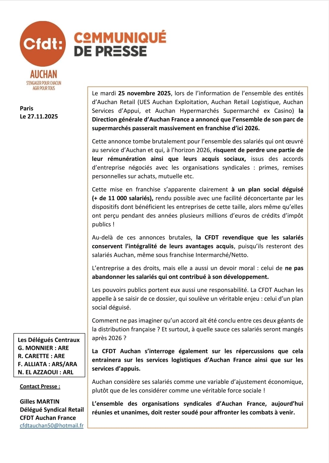 Communiqué de presse CFDT Supermarchés Auchan-Intermarché-Netto (27/11/2025)